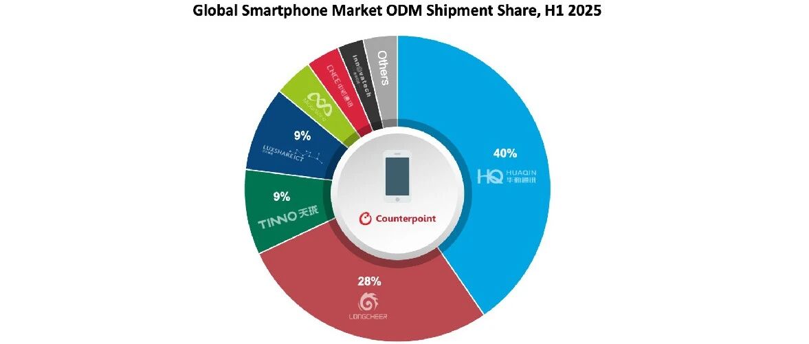 以下文章来源于Counterpoint 咨询 ,作者Counterpoint Counterpoint 咨询 . Counterpoint Research 是一家专注于科技行业的全球性研究公司,在全球主要的市场有着强大的影响 力。我们致力于为合作伙伴提供准确、及时的市场数据,帮助他们做出明智的决策。 与此同时,ODM厂商正不断加强研发投入并升级制造设施,以积极应对智能手机硬件的持续 迭代升级,同时扩大智能汽车关联业务、智能穿戴(手表、耳机、智能眼镜等),甚至布局 新型业务譬如机器人等。 2025年上半年,全球ODM智能手机出货量同比增长7%。 华勤与龙旗继续保持行业领先地位,双强格局稳固;天珑移动表现突出,跻身行业第三。 2025年上半年,全球智能手机出货量同比增长2%,而外包设计订单同比增长7%,表明OEM 厂商正通过加大ODM外包力度来应对激烈的市场竞争与成本压力。ODM设计的智能手机出 货量占全球总出货量的43%,创下2019年以来同期最高纪录。 全球智能手机市场ODM出货量份额,2025上半年 数据来源: Counterpoint Research 智能手机制造360服务 注:自2025年起,闻泰的 ...