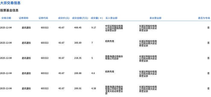 大宗交易概况 - 2025年12月4日,超讯通信发生大宗交易,总成交30.35万股,总成交金额1325.38万元,占该股当日总成交额的1.37% [1] - 本次大宗交易成交均价为43.67元,较当日市场收盘价50.76元折价13.97% [1] 交易明细分析 - 当日共发生5笔大宗交易,成交价格均为43.67元 [2] - 其中两笔交易的买方营业部显示为“机构专用”,成交金额分别为305.69万元(成交量7万股)和200.88万元(成交量4.6万股) [2] - 其余三笔交易的买方营业部分别为“合同意外面试器器”、“用含式 用品商品”和“有意公司成分量”,成交金额分别为400.45万元(成交量9.17万股)、218.35万元(成交量5万股)和200.01万元(成交量4.58万股) [2]