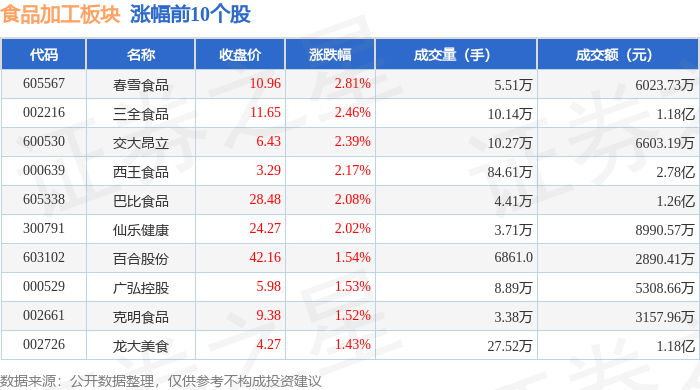 证券之星消息,12月18日食品加工板块较上一交易日上涨0.15%,春雪食品领涨。当日上证指数报收于 3876.37,上涨0.16%。深证成指报收于13053.98,下跌1.29%。食品加工板块个股涨跌见下表: | 代码 | 名称 | 主力净流出 (元) | 主力净占比 游资净流入 (元) | | 游资净占比 散户净流入(元) | | 散户净占比 | | --- | --- | --- | --- | --- | --- | --- | --- | | 002702 海欣食品 | | -4394.29万 | -5.64% | -2701.38万 | -3.46% | 7095.67万 | 9.10% | | 000895 双汇发展 | | -3549.47万 | -18.13% | 232.86万 | 1.19% | 3316.60万 | 16.94% | | 002515 | 金字火腿 | -2303.54万 | -13.32% | 918.43万 | 5.31% | 1385.12万 | 8.01% | | 603345 | 安井食品 | -1698.16万 | -5.54% | -1730.61万 | - ...