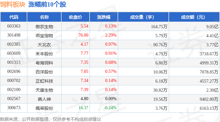 从资金流向上来看,当日饲料板块主力资金净流入1.0亿元,游资资金净流出1198.05万元,散户资金净流 出8830.21万元。饲料板块个股资金流向见下表: 证券之星消息,11月7日饲料板块较上一交易日下跌0.57%,海大集团领跌。当日上证指数报收于 3997.56,下跌0.25%。深证成指报收于13404.06,下跌0.36%。饲料板块个股涨跌见下表: | 代码 | 名称 | 收盘价 | 涨跌幅 | 成交量(手) | 成交额(元) | | --- | --- | --- | --- | --- | --- | | 603363 | 傲农生物 | 5.54 | 6.13% | 164.75万 | 9.05亿 | | 301498 | 乖宝宠物 | 76.00 | 2.29% | 5.79万 | 4.41亿 | | 002385 | 大北农 | 4.17 | 0.97% | 90.76万 | 3.77亿 | | 603609 | 禾丰股份 | 7.77 | 0.91% | 4.79万 | 3718.67万 | | 001313 | 超过奥圈 | 7.35 | 0.68% | 6.80万 | 4999.31万 | ...
