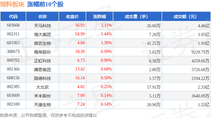 证券之星消息,12月29日饲料板块较上一交易日上涨1.5%,天马科技领涨。当日上证指数报收于 3965.28,上涨0.04%。深证成指报收于13537.1,下跌0.49%。饲料板块个股涨跌见下表: 从资金流向上来看,当日饲料板块主力资金净流入3896.16万元,游资资金净流入2892.86万元,散户资金 净流出6789.02万元。饲料板块个股资金流向见下表: | 代码 | 名称 | 主力净流入(元) | 主力净占比 游资净流入 (元) | | 游资净占比 散户净流入 (元) | | 散户净占比 | | --- | --- | --- | --- | --- | --- | --- | --- | | 603668 | 天马科技 | 5562.02万 | 12.48% | 1958.43万 | 4.40% | -7520.45万 | -16.88% | | 002100 | 天康生物 | 1613.46万 | 10.63% | -430.98万 | -2.84% | -1182.48万 | -7.79% | | 301498 乖宝宠物 | | 1485.93万 | 5.23% | -187.15万 | -0.6 ...