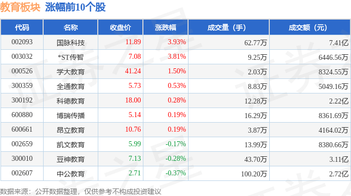 证券之星消息,11月3日教育板块较上一交易日上涨1.16%,ST东时领涨。当日上证指数报收于3976.52, 上涨0.55%。深证成指报收于13404.06,上涨0.19%。教育板块个股涨跌见下表: | 代码 | 名称 | 收盘价 | 涨跌幅 | 成交量(手) | 成交额(元) | | | --- | --- | --- | --- | --- | --- | --- | | 603377 | ST东时 | 3.66 | 3.39% | 15.38万 | | 5567.75万 | | 600636 | *ST国化 | 8.67 | 3.34% | 5.98万 | | 5112.94万 | | 300010 | 豆神教育 | 7.27 | 3.27% | 98.24万 | | 7.09亿 | | 605098 | 行动教育 | 41.72 | 2.91% | ﻝ 2.23万 | | 9266.68万 | | 300338 | ST开元 | 3.95 | 2.86% | 11.11万 | | 4369.21万 | | 003032 | *ST传智 | 6.87 | 2.54% | 5.37万 | | 3650.5 ...