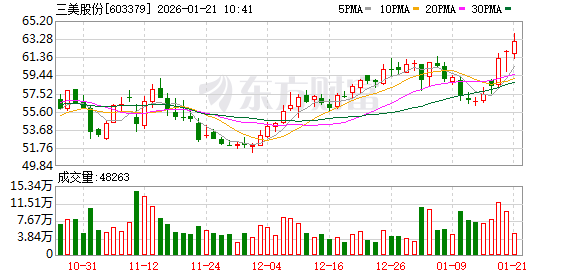 公司发布的三季报数据显示,前三季度公司共实现营业收入44.29亿元,同比增长45.72%,实现净利润 15.91亿元,同比增长183.66%,基本每股收益为2.6000元,加权平均净资产收益率22.33%。 1月16日公司发布2025年业绩预告,预计实现净利润19.90亿元至21.50亿元,同比变动区间为 155.66%~176.11%。(数据宝) (文章来源:证券时报网) 三美股份股价创出历史新高,截至10:08,该股上涨2.26%,股价报63.39元,成交量306.64万股,成交金 额1.91亿元,换手率0.50%,该股最新A股总市值达386.98亿元,该股A股流通市值386.98亿元。 证券时报·数据宝统计显示,三美股份所属的基础化工行业,目前整体涨幅为0.06%,行业内,目前股价 上涨的有193只,涨幅居前的有红墙股份、科创新源、闰土股份等,涨幅分别为10.00%、8.38%、 7.81%。股价下跌的有231只,跌幅居前的有博菲电气、能之光、七彩化学等,跌幅分别为9.53%、 6.36%、6.05%。 两融数据显示,该股最新(1月20日)两融余额为7.53亿元,其中,融资余额为7.52亿元,近10日减 ...