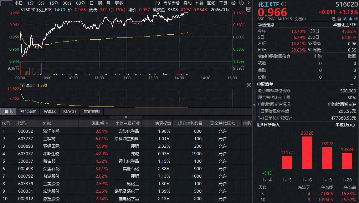 来源:沪深交易所等,截至2026.1.21。 注:投资者在申购或赎回基金份额时,申购赎回代理券商可按照不超过0.5%的标准收取佣金,其中包含证券交易所、登记机构等收取的相关费用。化工ETF 不收取销售服务费。 机构观点来源:①天风证券2026年1月14日证券研究报告《基础化工2026年年度策略:供需逆转、产业重构、价值重估》;②华鑫证券2026年1月20日《基础 化工行业研究:国内汽油、天然气等涨幅居前,建议关注进口替代、纯内需、高股息等方向》。 化工板块攻势不停!反映化工板块整体走势的化工ETF(516020)早盘走弱后迅速拉升翻红,而后持续高位震荡,截至发稿,场内价格涨1.15%,冲击日线 三连阳。 成份股方面,锂电、钾肥、磷化工等板块部分个股涨幅居前。截至发稿,浙江龙盛飙涨超9%,三棵树大涨超6%,亚钾国际、和邦生物、新宙邦等涨超4%。 | | | 多日 1分 5分 15分 30分 60分 日 | | 周 月 更多 | | | | F9 盘前盘后 叠加 九转 画线 工具 | | @ 0 | KTETE O | | | 51 | | --- | --- | --- | --- | --- | --- | ...