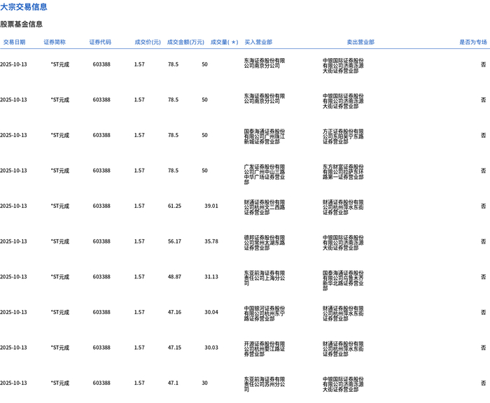 *ST元成现5笔大宗交易 合计成交225.61万股