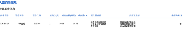 | 仅景垒立日心 | | | | | | | --- | --- | --- | --- | --- | --- | | 交易日期 | 证券简称 | 证券代码 | 成交价(元) 成交金额[万元) 成交量(*) 买入营业部 | | 奥出营业部 是否为专场 | | 025-10-24 | *ST元成 | 603388 | 30.95 30.95 | 菜園景點發展產品 | 發開解 190 | 10月24日,*ST元成大宗交易成交30.95万股,成交额30.95万元,占当日总成交额的24.09%,成交价1 元,较市场收盘价1元持平。 ...