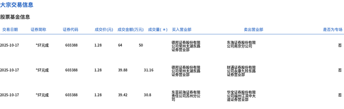 大宗交易概况 - 2025年10月17日,*ST元成发生大宗交易,总成交量111.96万股,总成交金额143.3万元,占该股当日总成交额的72.64% [1] - 大宗交易成交价为每股1.28元,与当日市场收盘价持平 [1] 交易明细分析 - 当日共发生三笔大宗交易,单笔成交量分别为50万股、31.16万股和30.8万股 [2] - 三笔交易的成交价均为每股1.28元,单笔成交金额分别为64万元、39.88万元和39.42万元 [2]