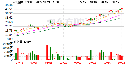 *ST亚振再度涨停,4个交易日内录得3个涨停,累计涨幅为15.78%,累计换手率为6.99%。截至10:27, 该股今日成交量266.35万股,成交金额1.18亿元,换手率1.01%。最新A股总市值达118.00亿元。 | 日期 | 当日涨跌幅(%) | 换手率(%) | 主力资金净流入(万元) | | --- | --- | --- | --- | | 2025.10.23 | 0.00 | 1.89 | 1595.02 | | 2025.10.22 | 5.01 | 2.14 | -503.36 | | 2025.10.21 | 5.00 | 1.94 | -1371.03 | | 2025.10.20 | -5.00 | 0.35 | -1907.61 | | 2025.10.17 | -5.00 | 0.42 | -1510.71 | | 2025.10.16 | 4.85 | 2.77 | -1730.90 | | 2025.10.15 | 4.99 | 1.55 | -1742.48 | | 2025.10.14 | 5.00 | 0.49 | 698.46 | | 2025.10.13 | 5. ...