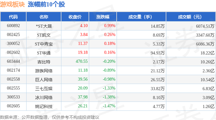 证券之星消息,10月16日游戏板块较上一交易日下跌1.29%,名臣健康领跌。当日上证指数报收于 3916.23,上涨0.1%。深证成指报收于13086.41,下跌0.25%。游戏板块个股涨跌见下表: 从资金流向上来看,当日游戏板块主力资金净流出8.33亿元,游资资金净流入2.05亿元,散户资金净流 入6.28亿元。游戏板块个股资金流向见下表: 以上内容为证券之星据公开信息整理,由AI算法生成(网信算备310104345710301240019号),不构成投资建议。 | 代码 | 名称 | 收盘价 | 涨跌幅 | 成交量(手) | 成交额(元) | | | --- | --- | --- | --- | --- | --- | --- | | 600892 | *ST大晟 | 4.10 | 0.99% | 14.85万 | 6074.51万 | | | 002425 | ST凯文 | 3.84 | 0.26% | 8.69万 | 3347.60万 | | | 300052 | ST中青宝 | 11.37 | 0.18% | 5.33万 | 6086.36万 | | | 002602 | ST华通 | 19.18 ...