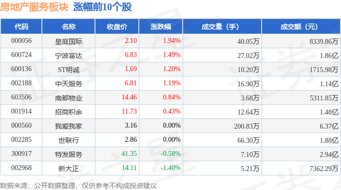 市场整体表现 - 2024年1月22日,房地产服务板块整体上涨0.29%,表现优于上证指数(上涨0.14%)和深证成指(上涨0.5%)[1] - 板块内个股表现分化,在统计的11只个股中,6只上涨,3只下跌,2只收平[1][2] - 从资金流向看,板块整体呈现主力资金净流出8838.54万元,游资资金净流出609.14万元,但散户资金净流入9447.68万元[2] 领涨个股分析 - 皇庭国际领涨板块,收盘价2.10元,单日涨幅1.94%,成交额8339.86万元[1] - 宁波富达涨幅居前,收盘价6.83元,上涨1.49%,成交额达1.86亿元[1] - ST明诚上涨1.20%,收盘价1.69元,主力资金净流入166.61万元,净占比达9.71%[1][3] 资金流向明细 - 特发服务获得主力资金净流入293.33万元,是板块中少数获得主力净流入的个股之一[3] - 我爱我家主力资金净流出规模最大,达2789.83万元,但其游资净流入2068.07万元,显示资金面存在分歧[3] - 宁波富达主力资金净流出1653.19万元,净占比-8.87%,但散户资金净流入2365.16万元,净占比12.69%[3] - 新大正主力资金净流出316.71万元,游资净流出724.55万元,但散户资金净流入1041.26万元,净占比14.14%[3] 成交活跃度 - 我爱我家成交最为活跃,成交量达200.83万手,成交额6.37亿元,在板块中遥遥领先[1][2] - 世联行成交量66.30万手,成交额1.88亿元,也属于成交较活跃的个股[1][2] - 南都物业、新大正成交量相对较小,分别为3.68万手和5.21万手[1][2]