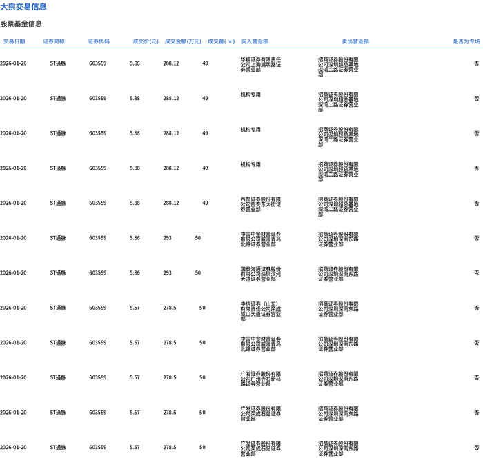 大宗交易概况 - 2026年1月20日,ST通脉发生大宗交易,总成交量595万股,总成交额3419.1万元,占该股当日总成交额的20.65% [1] - 该批大宗交易成交均价为5.75元,较当日市场收盘价6.03元折价4.7% [1] - 交易价格区间为5.57元至5.88元 [1] 交易明细分析 - 交易明细表显示,当日发生多笔大宗交易,涉及证券代码603559(ST通脉)及另一代码655609/655E09(疑似笔误,应为同一公司)[2] - 多笔交易成交价为5.88元,对应单笔成交金额288.12万元,成交量49万股 [2] - 另有成交价为5.86元的交易,对应成交金额293万元,成交量50万股 [2] - 还有多笔成交价为5.57元的交易,对应单笔成交金额278.5万元,成交量50万股 [2] - 部分交易的买入方或卖出方显示为“机构专用” [2]