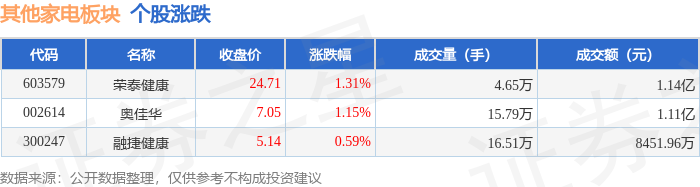 市场表现 - 2024年2月3日,其他家电板块整体上涨1.2%,表现强于大盘,当日上证指数上涨1.29%,深证成指上涨2.19% [1] - 板块内个股普涨,融捷健康领涨,收盘价为5.11元,涨幅为2.20%,荣泰健康收盘价为24.39元,涨幅为1.54%,奥佳华收盘价为6.97元,涨幅为1.16% [1] 交易情况 - 融捷健康成交最为活跃,成交量为17.69万手,成交额为8989.59万元,奥佳华成交量为17.01万手,成交额为1.18亿元,荣泰健康成交量为2.73万手,成交额为6641.84万元 [1] - 从资金流向看,板块整体主力资金净流出792.0万元,但游资资金净流入781.79万元,散户资金净流入10.21万元,显示市场资金存在分歧 [1] 个股资金流向 - 融捷健康主力资金净流出824.06万元,占成交额比例为-9.17%,但游资净流入358.16万元,散户净流入465.90万元,推动股价上涨 [1] - 荣泰健康主力资金净流入41.50万元,游资净流入114.40万元,但散户资金净流出155.89万元 [1] - 奥佳华主力资金净流出9.44万元,游资净流入309.24万元,散户资金净流出299.80万元 [1]