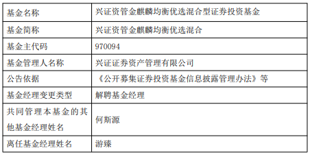 基金经理变更 - 兴证证券资产管理有限公司公告解聘基金经理游臻,其不再管理兴证资管金麒麟均衡优选混合 [1][2] - 游臻自2014年10月加入公司,历任交易员、投资经理等职,离任前担任公募投资部基金经理 [1] - 该基金由基金经理何斯源继续共同管理 [2] 基金产品表现 - 兴证资管金麒麟均衡优选混合A/B类份额今年以来收益率为16.94%,C类份额为16.15% [1] - 自2021年11月15日成立以来,A/B/C类份额收益率分别为-10.13%、-6.38%、-12.89% [1] - 截至2025年10月29日,A/B/C类份额累计净值分别为0.8987元、2.1265元、0.8711元 [1] - 该基金D/E类份额成立于2025年10月20日 [1]