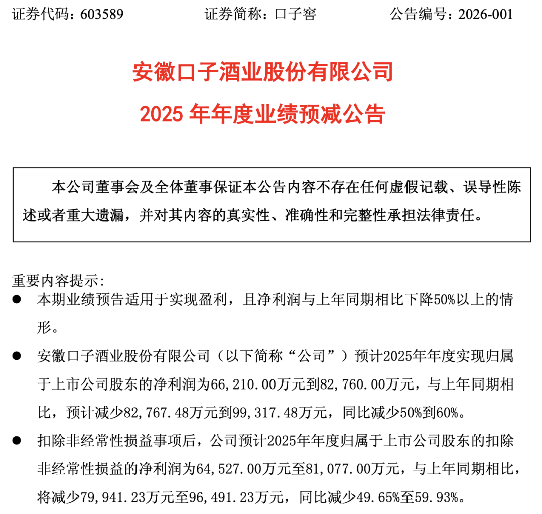 口子窖发预减,预计2025年度归母净利润6.62亿元到8.28亿元,同比减少50%到60%