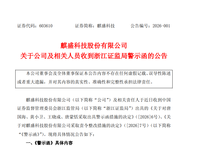 麒盛科技:公司及相关人员收到浙江证监局警示函