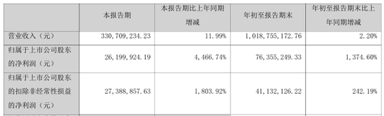 三季报披露接近尾声。 10月30日晚间,又有多家上市公司披露2025年三季报,其中,游族网络第三季度净利润同比增长4466.74%,平潭发展第三季度净利润同比增长 1970.63%…… | | 本报告期 | 本报告期比上年同期 | 年初至报告期末 | 年初至报告期末比上 | | --- | --- | --- | --- | --- | | | | 增减 | | 年同期增减 | | 营业收入(元) | 122, 199, 208, 07 | 8.99% | 373.086.597.23 | 9. 47% | | 归属于上市公司股东 的净利润(元) | 6. 204. 449. 32 | 1.082. 14% | 21, 518, 507, 40 | 1.714.99% | | 归属于上市公司股东 的扣除非经常性损益 | 6. 115. 948. 43 | 33.881. 57% | 19, 181, 443, 49 | 2. 900. 07% | | 的净利润(元) | | | | | | 经营活动产生的现金 | | | 23, 224, 382, 63 | 89. 35% | | 流量净额(元) | | | ...