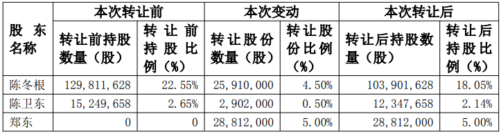 本次权益变动前,郑东未持有公司股份。本次权益变动后,郑东持有公司28,812,000股股份,占公 司总股本的5.00%,将成为公司持股5%以上股东。本次权益变动属于股份协议转让,不涉及要约收购, 不会导致公司控股股东及实际控制人发生变化,不会对公司持续稳定经营产生不利影响。 | 股 东 | 本次转让前 | 转 让 前 | 本次变动 | 转让股 | 本次转让后 | 转让后 | | --- | --- | --- | --- | --- | --- | --- | | 名称 | 转让前持股 数量(股) | 持 股 比 | 转让股份 数量(股) | 份比例 | 转让后持股数 畳(股) | 持股比 | | | | 例 (%) | | (%) | | 例 (%) | | 陈冬根 | 129, 811, 628 | 22. 55% | 25, 910, 000 | 4. 50% | 103, 901, 628 | 18. 05% | | 陈卫东 | 15, 249, 658 | 2. 65% | 2, 902, 000 | 0. 50% | 12, 347, 658 | 2.14% | | 郑东 | 0 | 0 | 28 ...