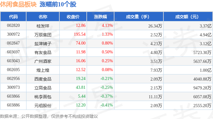 证券之星消息,10月17日休闲食品板块较上一交易日下跌0.21%,良品铺子领跌。当日上证指数报收于 3839.76,下跌1.95%。深证成指报收于12688.94,下跌3.04%。休闲食品板块个股涨跌见下表: | 代码 | 名称 | 收盘价 | 涨跌幅 | 成交量(手) | 成交额(元) | | | --- | --- | --- | --- | --- | --- | --- | | 002820 | 桂发祥 | 12.86 | 4.13% | 26.34万 | | 3.37亿 | | 300972 | 万辰集团 | 195.54 | 1.33% | 2.52万 | | 4.94亿 | | 002847 | 盐津铺子 | 74.00 | 0.80% | 4.23万 | | 3.12亿 | | 603697 | 有友食品 | 11.98 | 0.50% | 4.80万 | | 5723.30万 | | 603043 | 广州酒家 | 16.06 | 0.25% | 3.51万 | | 5637.66万 | | 002695 | 煌上煌 | 12.52 | 0.08% | 7.93万 | | 1.00亿 | | ...
