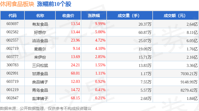 证券之星消息,1月22日休闲食品板块较上一交易日上涨0.47%,麦趣尔领涨。当日上证指数报收于 4122.58,上涨0.14%。深证成指报收于14327.05,上涨0.5%。休闲食品板块个股涨跌见下表: | 代码 | 名称 | 收盘价 | 涨跌幅 | 成交量(手) | 成交额(元) | | --- | --- | --- | --- | --- | --- | | 002719 | 麦趣尔 | 9.15 | 1.89% | 5.84万 | 5317.32万 | | 603697 | 有友食品 | 13.52 | 1.58% | 7.11万 | 9493.86万 | | 002695 | 煌上煌 | 12.35 | 1.40% | 6.41万 | 7905.11万 | | 002582 | 好想你 | 15.26 | 1.33% | 73.57万 | 11.26亿 | | 300972 | 万辰集团 | 212.06 | 1.11% | 2.05万 | 4.35 乙 | | 603719 | 良品铺子 | 12.08 | 1.00% | 4.16万 | 5009.58万 | | 603886 | 元祖股份 | ...