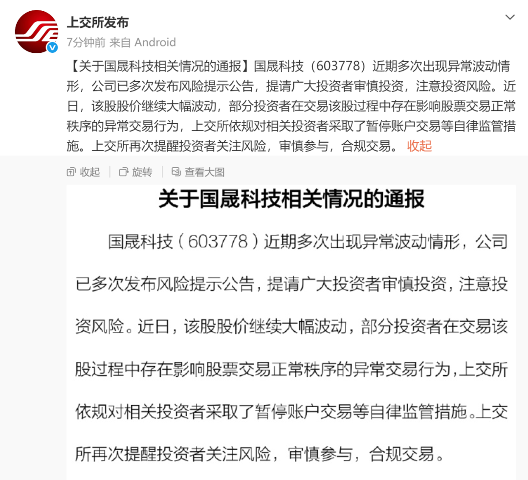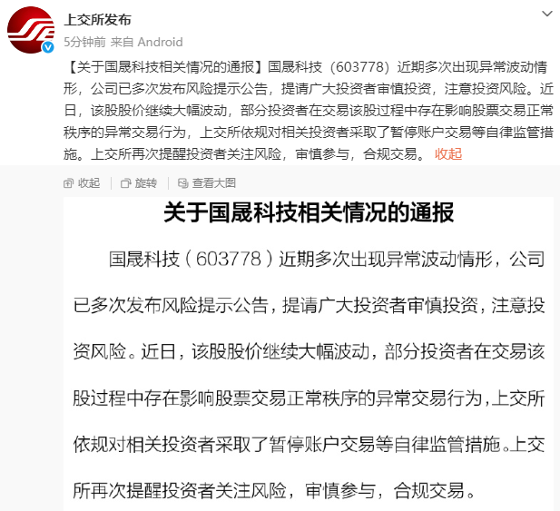 上交所出手,暂停国晟科技部分投资者账户交易!浙江证监局也有动作