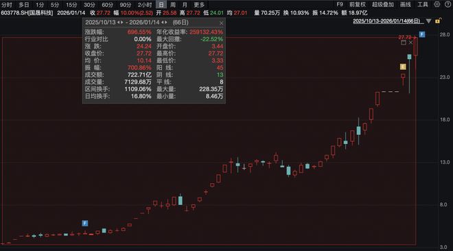 上交所监管通报与公司股价异常波动 - 上交所通报国晟科技股价近期多次出现异常波动,部分投资者存在影响正常交易秩序的异常交易行为,已被采取暂停账户交易等自律监管措施 [1] - 上交所提醒投资者关注风险,审慎参与,合规交易 [1] 公司停牌核查与风险提示 - 为维护投资者利益,国晟科技于1月6日申请停牌核查 [1] - 公司在2025年10月31日至2026年1月6日期间,股票5次触及股价异常波动、1次触及严重异常波动情形 [1] - 该期间公司股票累计涨幅高达370.20%,公司认为股价累计涨幅偏离基本面,存在市场情绪过热、非理性炒作及短期快速回落风险 [1] 股价表现与近期走势 - 公司股票自1月7日起停牌,于1月12日复牌,复牌当天再度涨停 [1] - 截至1月14日收盘,国晟科技涨停,股价报27.72元/股,再创新高 [1] - 该股股价自2025年10月13日走强以来,期间累计涨幅近700% [1]