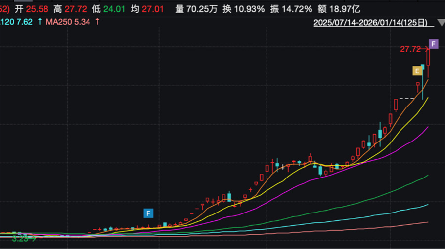 公司股价表现与市场炒作 - 公司股价在停牌三日后于1月14日再次涨停,收盘价为27.72元/股,总市值达182亿元 [1] - 公司股价从2025年9月23日的阶段低点3.23元/股,在三个半月内上涨近8.6倍 [1] - 2025年10月13日股价为3.5元/股,受增资固态电池项目消息影响,股价于11月20日最高涨至9.37元/股,随后在收购锂电池结构件公司消息推动下,于2026年1月6日停牌前最高涨至21.3元/股 [13] - 近期交易龙虎榜显示,多家知名游资营业部参与买卖,例如国信证券浙江互联网分公司买入3289.37万元并卖出2005.73万元 [14] - 因股价大幅波动及部分投资者存在异常交易行为,上海证券交易所已对相关投资者采取暂停账户交易等自律监管措施 [16] 公司业务转型与财务表现 - 公司前身为乾景园林,于2022年跨界进入光伏行业 [3] - 跨界后营收呈现快速增长:2022年营收1.98亿元,2023年飙升至9.88亿元,2024年进一步升至20.94亿元,三年增长约10倍 [4] - 但公司持续亏损且亏损额扩大:2023年亏损6888万元,2024年亏损1.06亿元,2025年前三季度亏损1.51亿元,并预计2025年全年业绩仍将亏损 [5] - 2025年前三季度总营收下滑至4.5亿元 [3] - 公司光伏业务毛利率为负,2025年半年报显示该业务毛利率为负11.7% [7] - 公司此前营收增长部分依赖于大客户订单,例如2024年与中广核集团相关的订单合计金额达19.35亿元 [7] 热点概念炒作与收购活动 - 2022年因蹭上光伏概念,公司股价在三个多月内翻3倍 [3] - 2025年以来,公司通过收购计划关联“固态电池”与“锂电”概念 [3] - 2025年7月,公司与山高新能源合作成立公司,并计划实施“年产10GWh固态电池产业链AI智能制造项目”,同年10月向该项目实施主体增资2.3亿元,持股51.11% [10] - 公司承认该固态电池投资项目“尚未开展实际经营”,且存在无法实现预期收益的风险 [10] - 2025年11月25日,公司公告拟以2.406亿元现金收购孚悦科技100%股权,切入锂电池结构件赛道 [11] - 标的公司孚悦科技2024年营收仅509.09万元,净利润亏损110.53万元;截至2025年8月31日净资产为1898.57万元,但评估值高达24060万元,增值率达1167.27% [11] - 公司在两个月内连续控股两家企业总斥资4.7亿元,但截至2025年9月末货币资金仅2.73亿元,资产负债率达70.5% [11] - 近期市场炒作公司将首席科学家过往航天太阳电池研究经历与“太空光伏”概念关联,但该科学家已于2008年离开相关研究所,且公司业务从未涉及太空光伏 [15] 公司治理与监管情况 - 公司实控人吴君、高飞于2023年通过控股股东协议转让获得控制权 [4] - 2024年1月29日,董事长吴君被监察机构留置,并于同年5月5日解除留置 [9] - 公司于2025年9月19日收到北京证监局出具的责令改正措施决定书 [11]
