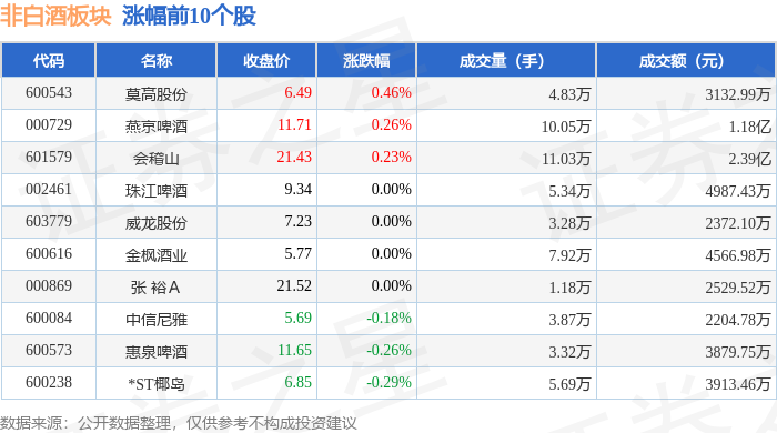 | 代码 | 名称 | 收盘价 | 涨跌幅 | 成交量(手) | 成交额(元) | | --- | --- | --- | --- | --- | --- | | 600084 | 中信尼雅 | 5.71 | 5.16% | 13.13万 | 7432.88万 | | 600238 | *ST椰岛 | 7.00 | 4.48% | 13.29万 | 9190.64万 | | 600543 | 莫高股份 | 6.33 | 2.76% | 9.67万 | 6106.06万 | | 603779 | 威龙股份 | 7.17 | 2.14% | 1 7.36万 | 5249.00万 | | 000752 | ST西发 | 11.39 | 1.24% | 4.11万 | 4674.06万 | | 600616 | 金枫酒业 | 5.76 | 0.88% | 9.09万 | 5213.49万 | | 000929 | *ST兰黄 | 8.80 | 0.80% | 2.75万 | 2412.85万 | | 600573 | 惠泉啤酒 | 11.50 | 0.79% | 3.97万 | 4557.55万 | | 600059 ...