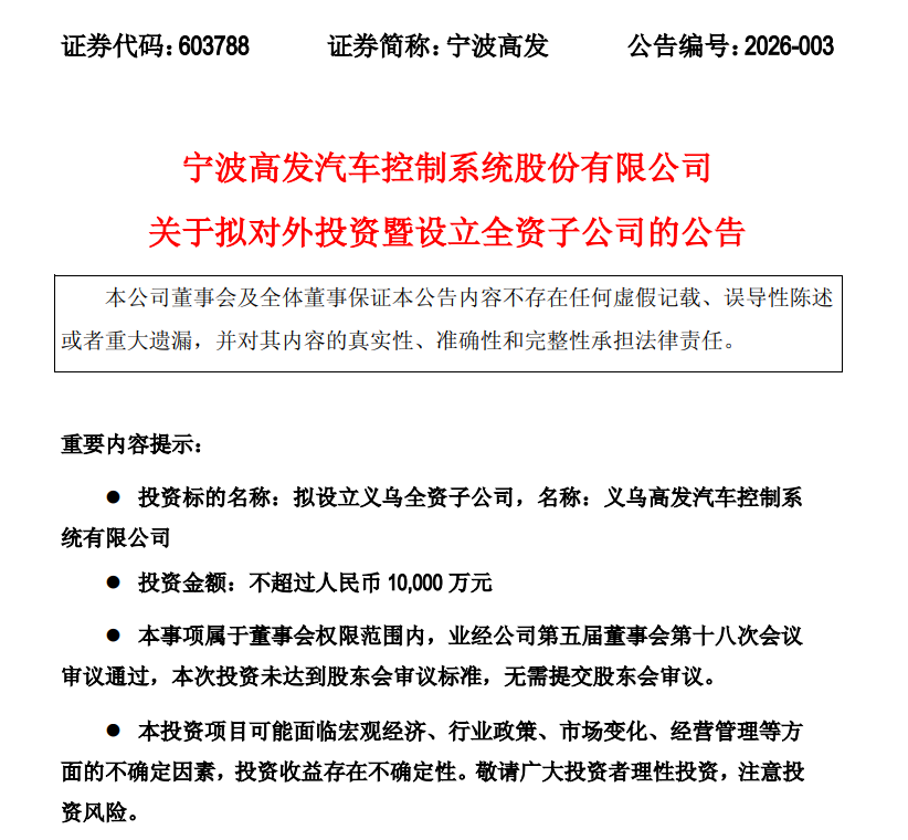 证券代码:603788 证券简称:宁波高发 公告编号:2026-003 宁波高发汽车控制系统股份有限公司 关于拟对外投资暨设立全资子公司的公告 本公司董事会及全体董事保证本公告内容不存在任何虚假记载、误导性陈述 或者重大遗漏,并对其内容的真实性、准确性和完整性承担法律责任。 重要内容提示: 投资标的名称:拟设立义乌全资子公司,名称:义乌高发汽车控制系 统有限公司 投资金额:不超过人民币 10,000 万元 本事项属于董事会权限范围内,业经公司第五届董事会第十八次会议 审议通过,本次投资未达到股东会审议标准,无需提交股东会审议。 本投资项目可能面临宏观经济、行业政策、市场变化、经营管理等方 面的不确定因素,投资收益存在不确定性。敬请广大投资者理性投资,注意投 资风险。 一、对外投资概述 (一)本次交易概况 | | √新设公司 | | --- | --- | | | □增资现有公司(□同比例 □非同比例) | | 投资类型 | --增资前标的公司类型:□全资子公司 □控股子公司 | | | □参股公司 □未持股公司 | | | □投资新项目 | | | □其他:_________ | | 投资标的名称 | 义乌高 ...
