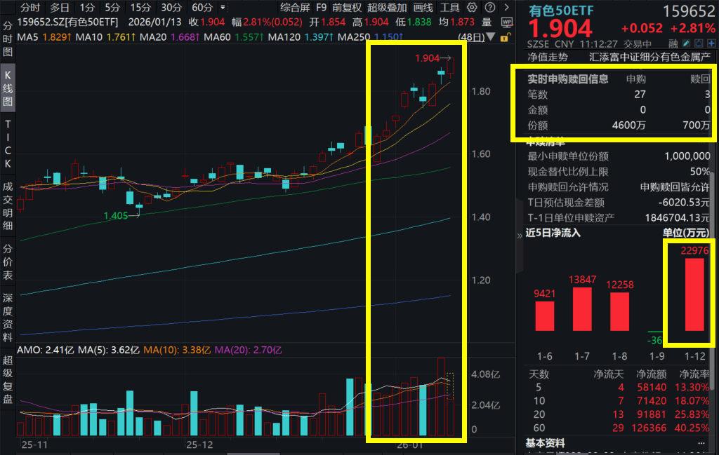 市场表现与资金流向 - 1月13日A股市场震荡分化,有色金属板块表现强劲,有色50ETF(159652)盘中二次冲高,涨幅超过2.8% [1] - 有色50ETF(159652)当日盘中强势吸金超过7300万元,近2日合计吸金超过3亿元 [1] - 成分股中,赣锋锂业暴涨超8.71%,兴业银锡涨超5.84%,山东黄金涨超5.49%,紫金矿业涨超3.89%,华友钴业、中国铝业涨超2%,北方稀土等出现回调 [2][7] 细分金属核心逻辑 - **锂(能源金属)**:政策调整驱动短期抢出口,利好碳酸锂价格。两部门公告自2026年4月1日起将电池产品增值税出口退税率由9%下调至6%,2027年1月1日起取消退税,此举可能引发抢出口需求,短期支撑碳酸锂走强 [5]。1月13日碳酸锂期货主力合约触及涨停,涨幅约12% [5]。东方证券认为,抢出口势头可能延续至2027年,碳酸锂供需进一步趋紧,价格预计继续强势运行 [8] - **黄金(贵金属)**:地缘冲突加剧与疲软就业数据支撑避险需求,金价上行空间打开。COMEX黄金价格站在4600美元/盎司上方震荡 [5]。中信建投指出,地缘冲突与弱于预期的非农就业数据推升贵金属价格,黄金4500美元/盎司上方空间打开 [8]。2025年全球黄金ETF创下年度资金流入历史新高,各国央行购金需求稳健 [8] - **铜(工业金属)**:供给刚性驱动铜价创新高。总量缺口叠加区域性错配推动铜价不断刷新历史高点 [5]。中信建投表示,2026年全球铜市场存在10余万吨总量缺口,同时因市场押注美国可能对精炼铜加征关税,导致贸易商向美国搬运精炼铜,造成非美地区供应紧张 [9]。铜价震荡上行,13000美元并非本轮铜价终点 [9] 行业宏观与政策催化 - 有色板块面临“宏观扰动频繁+供给侧刚性+需求侧新质动能”多重催化 [5] - 宏观层面,地缘事件再起波澜推升避险情绪,美国12月就业数据喜忧参半,市场关注美国CPI与PPI数据对美联储降息路径的影响 [6] - 供应层面,对铜等金属供应安全性的担忧以及美元汇率近期走软,对以美元计价的大宗商品价格构成支撑 [6] - 政策层面,电池出口退税政策下调是短期关键催化剂,可能刺激电池抢出口,增加对上游锂资源的需求 [5][8] 有色50ETF(159652)产品特征 - 标的指数全面覆盖金、铜、铝、锂、稀土等有色金属子板块 [9] - 指数“金铜含量”高,铜含量达34%,金含量达12%,合计高达46%,同类领先 [11] - 指数龙头集中度高,前五大成分股集中度高达38% [11]。前十大成分股包括紫金矿业(权重15.08%)、洛阳钼业(8.08%)、北方稀土(5.38%)、华友钴业(4.85%)、中国铝业(4.49%)等 [2] - 指数估值相对合理,市盈率(PE)为26.27倍,相比5年前下降了52% [13]。自统计区间起,指数累计涨幅达99.61%,主要来自盈利驱动而非估值提升 [13]