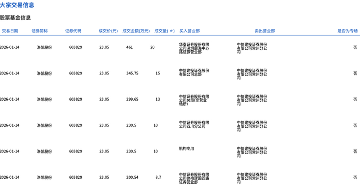 1月14日,洛凯股份大宗交易成交76.7万股,成交额1767.94万元,占当日总成交额的3.39%,成交价 23.05元,较市场收盘价26.49元折价12.99%。 | 交易日期 | 证券简称 | 证券代码 | | 成交价(元) 成交金额(万元) 成交量(*) 买入营业部 | | 卖出营业部 | 是否为专场 | | --- | --- | --- | --- | --- | --- | --- | --- | | 2026-01-14 | 洛凯股份 | 603829 | 23.05 | 461 | 20 2017 202 202 11:54 10 | 有限公司常用分公 | 조 | | 2026-01-14 | 洛凯股份 | 603829 | 23.05 | 345.75 | 15 有限公司总量 | 有限公司需求分公 | KI | | 2026-01-14 | 洛凯股份 | 603829 | 23.05 | 299.65 | 13 CERREAL | 要屬於前景的分裂 | KO | | 2026-01-14 | 洛凯股份 | 603829 | 23.05 | 230.5 | 10 2 2 2 2 1 3 3 1 ...