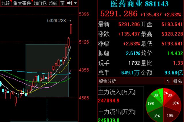 医药商业板块市场表现 - 医药商业板块指数在11月12日大幅上涨,创下年内新高 [1] - 板块内个股近全线飘红,多只个股出现涨停 [3] 重点个股表现 - 药易购开盘约4分钟即20%涨停,涨幅达+19.99%,总市值33.59 Z,现价35.14 [3][4] - 合富中国高开后秒封涨停,涨幅+10.02%,近12个交易日收获11个涨停板,总市值79.97 Z,现价20.09 [3][4] - 人民同泰开盘一字涨停,实现三连板,涨幅+10.04%,总市值72.49 Z,现价12.50 [3][4] - 建发致新上涨14.86%,总市值154.01 Z,现价36.55 [3][4] - 大参林上涨4.67%,总市值222.1 Z,现价19.50 [3][4] - 英特集团跟涨2.71%,总市值63.251 Z,现价12.12 [3][4]