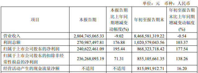 财务业绩概览 - 2025年前三季度公司营业收入为84.59亿元,同比下降0.54% [1] - 2025年前三季度归属于上市公司股东的净利润为8.68亿元,同比大幅增长177.54% [1] - 2025年第三季度单季营业收入为28.05亿元,同比下降9.02% [1] - 2025年第三季度单季归属于上市公司股东的净利润为2.41亿元,同比大幅增长195.44% [1] 盈利能力分析 - 2025年前三季度归属于上市公司股东的扣除非经常性损益的净利润为8.55亿元,同比增长138.26% [1] - 2025年第三季度单季扣除非经常性损益的净利润为2.36亿元,同比增长71.31% [1] - 2025年前三季度营业总成本为75.32亿元,较上年同期的79.79亿元有所下降 [4] - 2025年前三季度营业成本为31.92亿元,较上年同期的36.51亿元下降 [4] 费用结构 - 2025年前三季度销售费用为33.41亿元,上年同期为32.71亿元 [2][4] - 2025年前三季度研发费用为1.54亿元,上年同期为1.80亿元 [2][4] - 2025年前三季度管理费用为6.34亿元,上年同期为6.64亿元 [4] - 2025年前三季度财务费用为8523万元,上年同期为8998万元 [4] 现金流与市场反应 - 2025年前三季度经营活动产生的现金流量净额为8.15亿元,同比增长16.20% [1] - 公司于10月30日发布财报后,当日股价收跌5.64% [4]