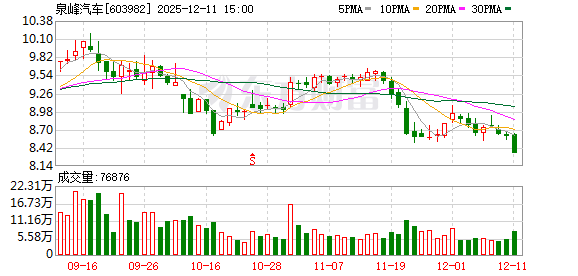 每经头条(nbdtoutiao)——白金信用卡权益大缩水:贵宾厅限次、酒店减量⋯⋯银行吐槽没赚头,"羊 毛党"薅了个寂寞 (记者 王瀚黎) 每经AI快讯,泉峰汽车(SH 603982,收盘价:8.6元)12月10日晚间发布公告称,公司第四届第一次董 事会会议于2025年12月10日在公司会议室以现场结合通讯方式召开。会议审议了《关于续聘高级管理人 员的议案》等文件。 2024年1至12月份,泉峰汽车的营业收入构成为:汽车零部件业务占比98.96%,家电零部件业务占比 0.68%,其他业务占比0.34%,其他零部件业务占比0.02%。 截至发稿,泉峰汽车市值为31亿元。 ...