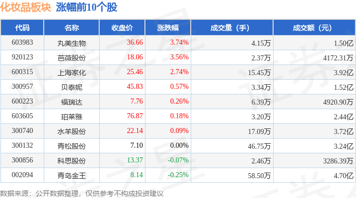 板块整体表现 - 10月29日化妆品板块整体上涨0.77%,表现优于上证指数(上涨0.7%)和深证成指(上涨1.95%)[1] - 板块内个股表现分化,丸美生物以3.74%的涨幅领涨,而华业香料跌幅最大,为-2.25%[1][2] 领涨个股表现 - 丸美生物收盘价36.66元,涨幅3.74%,成交量为4.15万手,成交额为1.50亿元[1] - 芭薇股份收盘价18.06元,涨幅3.56%,成交量为2.37万手,成交额为4172.31万元[1] - 上海家化收盘价25.46元,涨幅2.74%,成交量为15.45万手,成交额为3.92亿元[1] 资金流向 - 当日化妆品板块整体呈现主力资金和游资净流出,主力资金净流出8936.97万元,游资资金净流出5147.15万元[2] - 散户资金呈现净流入状态,净流入金额为1.41亿元[2] - 上海家化主力资金净流出规模最大,为3236.23万元,主力净占比为-8.25%[3] - 青松股份是少数获得主力资金净流入的个股,净流入795.17万元,主力净占比为2.45%[3] 成交活跃度 - 青岛金王成交量最为活跃,达到58.50万手,成交额为4.70亿元[1][2] - 青松股份成交量也较高,为46.75万手,成交额为3.24亿元[1][2] - 水羊股份成交量为17.09万手,成交额为3.72亿元[1][2]