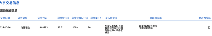 大宗交易概况 - 10月16日发生一笔大宗交易,成交量为70.00万股,成交金额为1099.00万元,成交价为15.70元,与当日收盘价持平[2] - 该笔交易买方为华泰证券北京西三环国际财经中心证券营业部,卖方为国泰海通证券股份有限公司总部[2] - 近3个月内公司累计发生4笔大宗交易,合计成交金额达1.68亿元[2] 近期股价与资金表现 - 10月16日公司收盘价为15.70元,当日下跌3.74%,日换手率为1.39%,成交额为38.55亿元[2] - 当日主力资金净流出4.57亿元,近5日公司股价累计下跌9.09%,近5日资金合计净流出22.03亿元[2] 融资余额变动 - 公司最新融资余额为31.64亿元,近5日增加3.10亿元,增幅为10.88%[3] 公司基本信息 - 公司全称为洛阳栾川钼业集团股份有限公司,成立于1999年12月22日,注册资本为427886.20352万人民币[3]