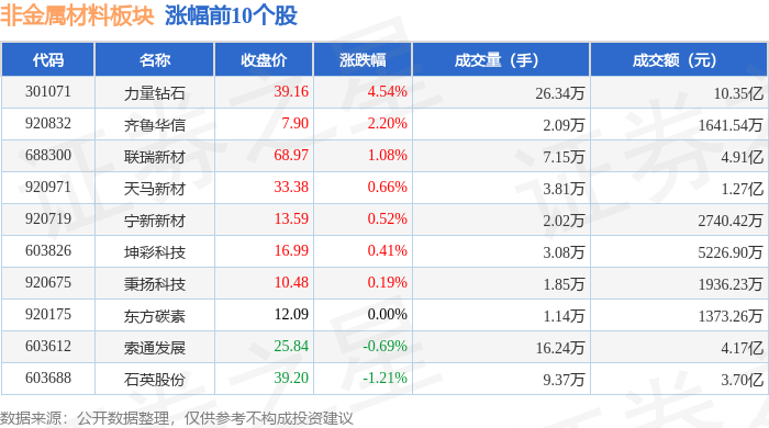 证券之星消息,1月20日非金属材料板块较上一交易日下跌0.09%,龙高股份领跌。当日上证指数报收于 4113.65,下跌0.01%。深证成指报收于14155.63,下跌0.97%。非金属材料板块个股涨跌见下表: | 代码 | 名称 | 收盘价 | 涨跌幅 | 成交量(手) | 成交额(元) | | | --- | --- | --- | --- | --- | --- | --- | | 301071 | 力量钻石 | 39.16 | 4.54% | 26.34万 | | 10.35 Z | | 920832 | 齐鲁华信 | 7.90 | 2.20% | 2.09万 | 1641.54万 | | | 688300 | 联瑞新材 | 68.97 | 1.08% | 7.15万 | | 4.91亿 | | 920971 | 天马新材 | 33.38 | 0.66% | - 3.81万 | | 1.27亿 | | 920719 | 宁新新材 | 13.59 | 0.52% | 2.02万 | 2740.42万 | | | 603826 | 坤彩科技 | 16.99 | 0.41% | 3.08万 | 5226.9 ...