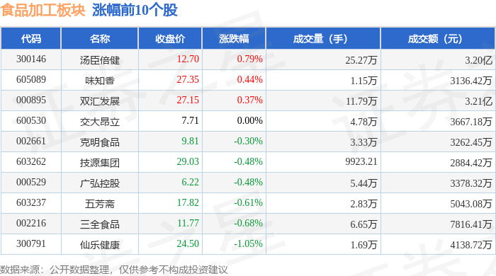 板块整体表现 - 食品加工板块在统计日整体下跌0.76%,表现弱于大盘,同期上证指数下跌0.81%,深证成指下跌0.92% [1] - 板块内个股表现分化,在列出的20只个股中,4只上涨,1只平盘,15只下跌 [1][2] 领涨个股表现 - 汤臣倍健领涨板块,收盘价12.70元,上涨0.79%,成交额3.20亿元,成交量25.27万手 [1] - 味知香上涨0.44%,收盘价27.35元,成交额3136.42万元 [1] - 双汇发展上涨0.37%,收盘价27.15元,成交额3.21亿元 [1] 领跌个股表现 - 华统股份领跌板块,跌幅达4.05%,收盘价11.37元,成交额4.37亿元,成交量38.29万手 [2] - 海欣食品同样下跌4.05%,收盘价5.45元,成交额4.64亿元,成交量84.72万手 [2] - 金字火腿下跌3.12%,收盘价6.22元,成交额2.06亿元 [2] 板块资金流向 - 食品加工板块整体呈现主力资金净流出,净流出金额为3.95亿元 [2] - 游资资金净流入2571.12万元,散户资金净流入3.69亿元 [2] - 双汇发展是表中唯一呈现主力资金净流入的个股,净流入232.59万元,主力净占比0.72% [3] - 仙乐健康主力资金净流出462.22万元,主力净占比-11.17%,为表中占比最高 [3]
