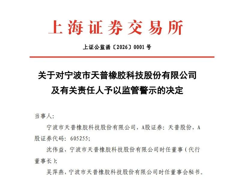 1月5日,上交所网站发布关于对宁波市天普橡胶科技股份有限公司(简称"天普股份(605255)")及有关 责任人予以监管警示的决定。 图片来源:上交所 2025年12月31日,上交所向天普股份下发监管工作函,涉及对象为上市公司、董事、高级管理人员、控股 股东及实际控制人;处理事由为公司涉嫌信息披露违规。 天普股份于2025年12月31日开市起停牌核查,目前仍未复牌。同花顺(300033)数据显示,2025年,该股 股价累计涨幅达1663.20%。 信息披露不准确、不完整 据上交所查明,2025年12月29日、2025年12月30日,天普股份股价连续两个交易日涨停,并于2025年12月 29日触及异常波动标准。2025年12月30日、2025年12月31日公司分别披露《股票交易异常波动公告》《关 于股票交易风险提示暨停牌核查公告》。相关公告均称,截至目前,公司无开展人工智能相关业务的计 划,不存在应披露而未披露的重大信息。 天普股份于2025年12月26日完成全资子公司杭州天普欣才科技有限公司(简称"天普欣才")的工商设立登 记手续。公开的工商登记信息显示,天普欣才主要经营范围是集成电路芯片设计及服务、人工智能理 ...