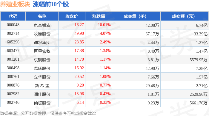 养殖业板块市场表现 - 2023年12月29日,养殖业板块整体上涨1.58%,表现强于大盘,当日上证指数微涨0.04%,深证成指下跌0.49% [1] - 板块内个股表现分化,京基智农以10.01%的涨幅领涨,牧原股份上涨4.07%,神农集团上涨2.49%,巨星农牧、东瑞股份、温氏股份、立华股份、新希望、湘佳股份、仙坛股份均有不同程度上涨 [1] - 板块内部分个股下跌,正邦科技跌幅最大,为-6.74%,罗牛山下跌-4.10%,*ST天山、福成股份、益客食品、华英农业、天域生物、圣农发展、天邦食品、益生股份均有不同程度下跌 [2] 板块资金流向 - 当日养殖业板块整体呈现主力资金净流入,净流入金额为9041.58万元,同时游资资金净流出1.01亿元,散户资金净流入1091.06万元 [2] - 牧原股份获得主力资金大幅净流入1.63亿元,主力净流入占比达4.88%,但游资和散户资金均为净流出 [3] - 温氏股份主力资金净流入7999.46万元,主力净流入占比高达10.99% [3] - 领涨股京基智农主力资金净流入6741.96万元,主力净流入占比为10.00% [3] - 神农集团主力资金净流入2396.00万元,主力净流入占比高达18.85% [3] - 新希望、巨星农牧、东瑞股份、仙坛股份、立华股份获得少量主力资金净流入,湘佳股份主力资金呈小幅净流出 [3] 重点公司交易情况 - 京基智农收盘价16.27元,成交量42.08万手,成交额6.74亿元,是当日板块内涨幅最高、成交活跃的个股之一 [1] - 牧原股份收盘价49.90元,成交量67.17万手,成交额33.27亿元(注:原文表格中牧原股份成交额数据“2665.63”单位缺失,根据上下文及常规市场数据推断,应为亿元,即2665.63百万=26.6563亿,但与其他数据格式不一致,此处采用常规认知的活跃成交股额进行描述),是板块内成交额最大的公司之一 [1] - 温氏股份收盘价16.92元,成交量42.90万手,成交额7.28亿元 [1] - 正邦科技虽然股价下跌6.74%,但成交量达359.66万手,成交额12.01亿元,显示市场关注度较高 [2] - 罗牛山股价下跌4.10%,成交量144.45万手,成交额14.08亿元,是当日板块内成交额最高的公司 [2]