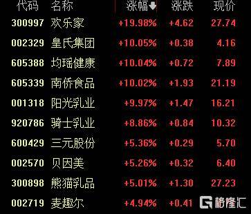 其中,皇氏集团、均瑶健康、南侨食品、阳光乳业涨停,骑士乳业涨超8%,三元股份、贝因美等跟涨。 | 代码 | 名称 | 张幅号 张庆 | 现价 | | --- | --- | --- | --- | | 300997 欢乐家 | | +19.98% 44.62 | 27.74 | | 002329 皇氏集团 | | +10.05% +0.38 | 4.16 | | 605388 均瑶健康 | | +10.04% +0.72 | 7.89 | | 605339 南侨食品 | | +10.02% +1.93 | 21.19 | | 001318 阳光影 | | +9.97% +1.47 | 16.21 | | 77786 骑士歌,业 | | +8.86% +0.84 | 10.32 | | 600429 三元股份 | | +5.36% +0.29 | 5.70 | | 002570 贝因美 | | +5.26% +0.32 | 6.40 | | 300898 熊猫乳品 | | +5.01% +1.30 | 27.23 | | 002719 麦越尔 | | +4.94% +0.41 5 紓壓ໂ | | 今日A股市场婴 ...