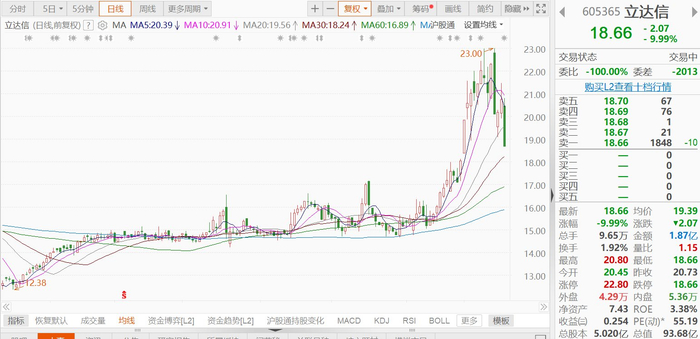 值得一提的是,此前公布的第三季度归母净利润5814.73万元,同比下降55.18%。本报告期立达信公司 应收账款体量较大,当期应收账款占最新年报归母净利润比达319.53%。 昨日跌停的立达信(605365.SH)盘中再度触及跌停,近日连续下跌抹平此前涨幅,现报16.83元创月内新 低,总市值84.5亿元。 消息上,立达信日前发布股份减持公告,股东李春华拟减持公司股份不超过781.58万股,减持比例不超 过公司总股本的1.56%。公告显示,李春华与控股股东、实际控制人之一的李江淮为姐弟关系。 ...
