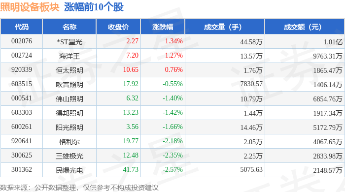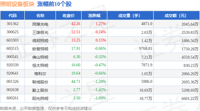 | 代码 | 名称 | 收盘价 | 涨跌幅 | 成交量(手) | 成交额(元) | | --- | --- | --- | --- | --- | --- | | 605365 | 立达信 | 18.66 | -9.99% | 9.86万 | 1.91亿 | | 001326 | 联域股份 | 45.29 | -3.80% | 7342.13 | 3377.52万 | | 002723 | 小松股份 | 7.69 | -3.39% | 11.92万 | 9252.63万 | | 002638 | 勤上股份 | 2.81 | -2.77% | 27.90万 | 7907.81万 | | 301362 | 民爆光电 | 41.73 | -2.57% | 5075.63 | 2148.57万 | | 300625 | 三雄极光 | 12.48 | -2.35% | 2.25万 | 2833.98万 | | 920641 | 格利尔 | 19.77 | -2.18% | 2.05万 | 4067.65万 | | 600261 | 阳光照明 | 3.56 | -1.66% | 14.46万 | 5172.79万 | | ...
