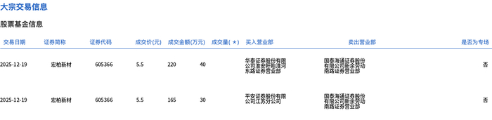大宗交易概况 - 2025年12月19日,宏柏新材发生大宗交易,成交70万股,成交金额385万元,占该股当日总成交额的6.09% [1] - 该笔大宗交易成交价为5.5元,较当日市场收盘价6.1元折价9.84% [1] 交易明细分析 - 当日大宗交易记录显示有两笔成交,合计成交70万股,总金额385万元,与总体数据吻合 [2] - 第一笔成交40万股,成交金额220万元,卖出营业部为“新闻”,买入营业部为“2012” [2] - 第二笔成交30万股,成交金额165万元,卖出营业部为“丟高任务劈发有限”,买入营业部为“2000” [2] - 两笔交易的成交价均为5.5元,与总体披露的成交价一致 [1][2]