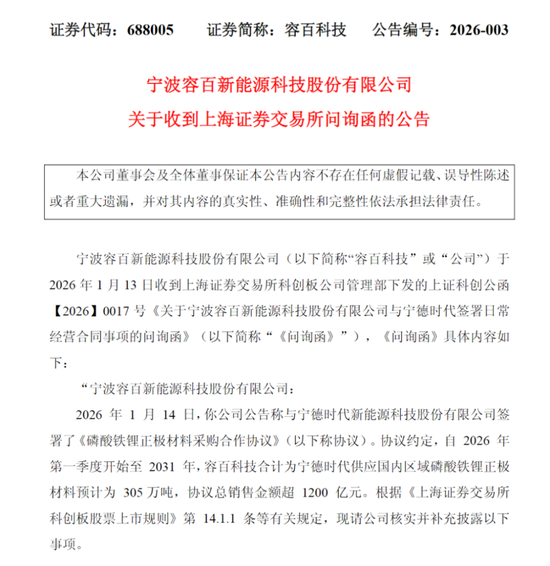 事件概述 - 2026年1月13日深夜,容百科技收到上海证券交易所问询函,并于1月14日临时停牌一天,停牌原因为重要事项未公告 [1] - 上交所要求公司在1个交易日内回复问询函问题 [1] - 问询函关注的核心是公司于下发问询函当天公告的与宁德时代签署的《磷酸铁锂正极材料采购合作协议》 [3] 合作协议核心内容 - 协议约定,自2026年第一季度开始至2031年,容百科技合计为宁德时代供应国内区域磷酸铁锂正极材料预计为305万吨 [3] - 协议总销售金额超1200亿元 [3] - 在满足对方技术、成本、质量、交付需求的前提下,宁德时代给予公司项目开发的优先权,并优先导入、使用公司提供的磷酸铁锂正极材料 [5] - 最终采购量及需求保障以双方后续签订的框架性、年度性或单笔采购合同为准 [5] - 双方未依协议履行强制性义务,违约方需承担违约责任并支付违约金 [5] 上交所问询要点:信息披露准确性 - 根据公司提交的公告及备查文件,协议中并未对总销售金额进行约定,公司未公告销售金额的确定依据 [4] - 公司前期公告显示,2025年12月披露收购的贵州新仁新能源科技有限公司目前拥有年产6万吨磷酸铁锂产线 [4] - 公司已披露的建成磷酸铁锂产能与本次协议预计供应的产量相差甚远 [4] - 上交所要求公司补充披露协议中关于每年产能的具体约定,并结合拟建/在建产能、产能收购计划、资金储备和战略规划等,明确说明是否具备相应履约能力 [5] - 要求公司自查协议周期长达6年、原材料价格波动风险、采购需求不确定性、产能储备不可预期性等因素对披露内容准确性的影响 [5] 上交所问询要点:协议内容细节 - 要求公司补充披露截至目前双方是否已签署关于产能建设、各年交付量、产品销售价格调整机制等约定 [6] - 要求公司全面自查并完整披露协议的全部重要内容 [6] - 要求公司补充披露目前是否拥有产品交付所需的技术、标准、质量等前提条件,以及为达预期所需支出的各项成本费用对公司生产经营和财务状况的影响 [6] - 要求公司补充披露协议约定的双方强制性义务及具体违约责任,以及触发违约责任对公司的预计影响 [6] 上交所问询要点:内幕交易防控与内部程序 - 要求公司就本次协议签订事项进行内幕信息知情人登记备案,并自查有无存在内幕交易情况,将自查结果对外披露并提交内幕知情人名单备查 [6] - 要求公司全面自查并披露相关协议签署履行的内部决策程序,核实内部控制规范性和执行的有效性 [6] - 要求公司核实相关信息披露是否真实、准确、完整,是否存在夸大表述和广告宣传用语,是否符合科创板上市规则 [6] - 要求公司明确说明是否存在借大额合同进行股价炒作的动机 [6] 协议规模与公司及行业对比 - 协议总销售金额超1200亿元,金额巨大 [3] - 容百科技2023年、2024年及2025年前三季度营收分别为226.57亿元、150.88亿元、89.86亿元 [8] - 2026年至2031年超1200亿元的协议总销售金额,较公司近年营收而言金额巨大 [8] - 协议预计供应量为305万吨 [3] - 据行业统计,2025年中国磷酸铁锂产量为392.02万吨 [8] - 2025年行业头部企业湖南裕能年产量突破100万吨,二梯队企业则在30万吨左右 [8] - 容百科技披露的2026年至2031年预计305万吨供应量,相较于磷酸铁锂行业目前规模而言亦不容小觑 [8] 后续要求与程序 - 上交所要求公司收到问询函后立即披露,并在1个交易日内就上述问题以书面形式回复,并按要求履行信息披露义务 [6] - 后续上交所将结合公司回复情况启动纪律处分程序 [7]