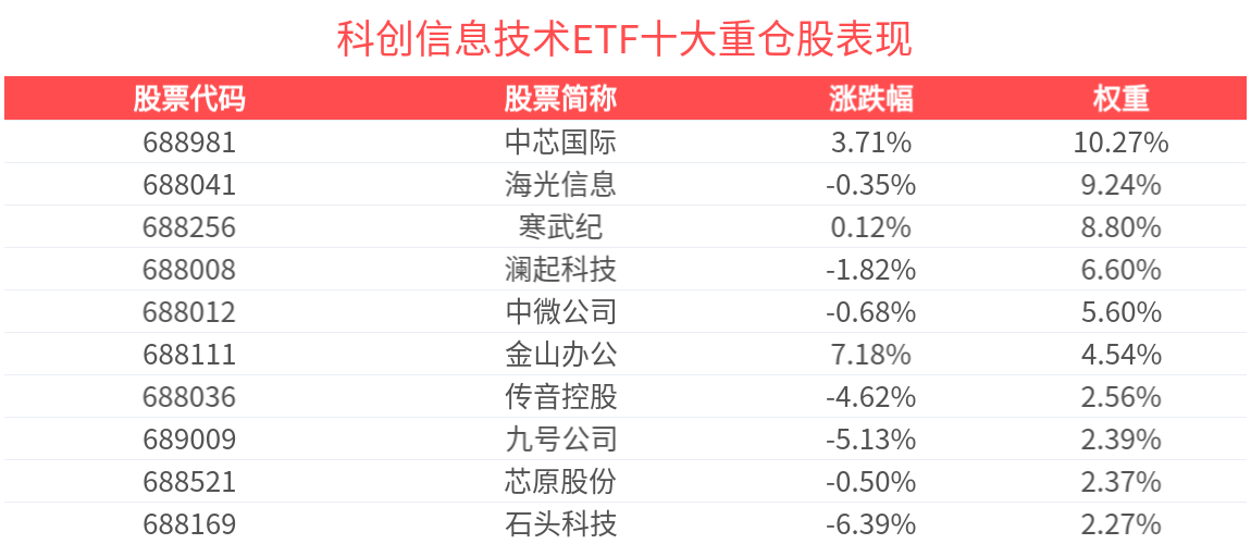 截至2025年10月13日 11:24,上证科创板新一代信息技术指数上涨0.37%,成分股华虹公司上涨13.54%,金山办公、晶合集成、达梦数据、沪硅产业跟涨。 科创信息技术ETF(588100)上涨0.20%。拉长时间看,截至2025年10月10日,科创信息技术ETF近1月累计上涨10.86%。 流动性方面,科创信息技术ETF盘中换手12.17%,成交3304.10万元,市场交投活跃。拉长时间看,截至10月10日,科创信息技术ETF近1周日均成交1.24亿 元。 截至10月10日,科创信息技术ETF近3年净值上涨143.41%,指数股票型基金排名29/1883,居于前1.54%。从收益能力看,截至2025年10月10日,科创信息技 术ETF自成立以来,最高单月回报为32.25%,最长连涨月数为4个月,最长连涨涨幅为63.37%,上涨月份平均收益率为9.73%。 中信证券认为,在市场风格维持高位震荡背景下,仍围绕科技主线,风格偏向半导体板块展开交易。从催化因素和时序上看,下半年通常是国产科技行业的 技术发布、新品迭代的密集周期,半导体、AI应用、AI算力、海外储能及风电等方向确定性持续增强。 数据显示,截至2 ...