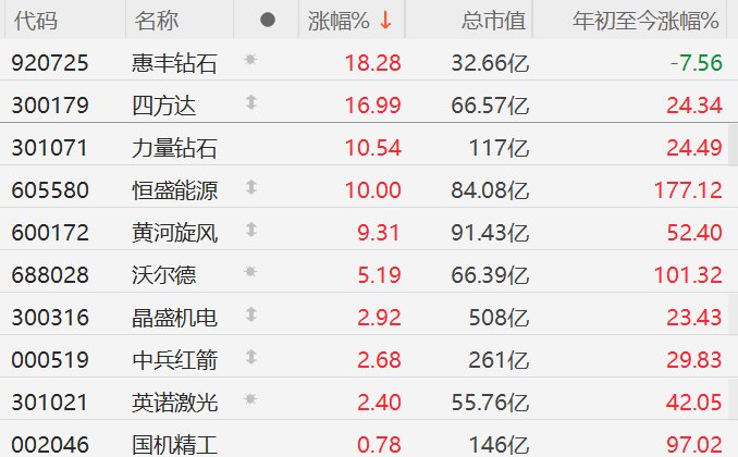 MACD金叉信号形成,这些股涨势不错! | 代码 | 名称 | | 涨幅% ↓ | 总市值 | 年初至今涨幅% | | --- | --- | --- | --- | --- | --- | | 920725 | 惠丰钻石 | 章 | 18.28 | 32.66亿 | -7.56 | | 300179 | 四方达 | + | 16.99 | 66.57 乙 | 24.34 | | 301071 | 力量钻石 | | 10.54 | 117亿 | 24.49 | | 605580 | 恒盛能源 | 1 | 10.00 | 84.08亿 | 177.12 | | 600172 | 黄河旋风 | 1 | 9.31 | 91.43亿 | 52.40 | | 688028 | 沃尔德 | 策 | 5.19 | 66.39亿 | 101.32 | | 300316 | 晶盛机电 | + | 2.92 | 508亿 | 23.43 | | 000519 | 中兵红箭 | 1 | 2.68 | 261亿 | 29.83 | | 301021 | 英诺激光 | # | 2.40 | 55.76亿 | 42.05 | | 002 ...