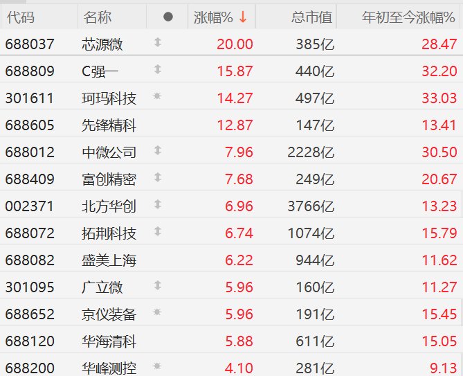 MACD金叉信号形成,这些股涨势不错! | 代码 | 名称 | | 涨幅% ↓ | 总市值 | 年初至今涨幅%。 | | --- | --- | --- | --- | --- | --- | | 688037 | 芯源微 | 1 | 20.00 | 385亿 | 28.47 | | 6888809 | C强一 | 1 | 15.87 | 440亿 | 32.20 | | 301611 | 珂玛科技 | 来 | 14.27 | 497亿 | 33.03 | | 688605 | 先锋精科 | | 12.87 | 147亿 | 13.41 | | 688012 | 中微公司 | 1 | 7.96 | 2228亿 | 30.50 | | 688409 | 富创精密 | 1 | 7.68 | 249亿 | 20.67 | | 002371 | 北方华创 | 1 | 6.96 | 3766亿 | 13.23 | | 688072 | 拓荆科技 | 1 | 6.74 | 1074亿 | 15.79 | | 688082 | 盛美上海 | | 6.22 | 944 Z | 11.62 | | 301095 | 广立微 | ...