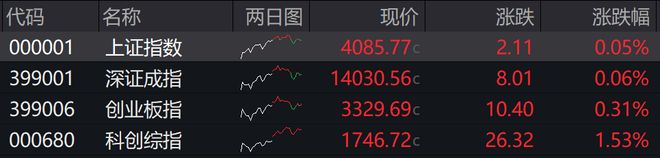 2026.01.07 本文字数:704,阅读时长大约2分钟 作者 |一财阿驴 1月7日,A股指数全天窄幅震荡,截至收盘,沪指涨0.05%,深成指涨0.06%,创业板指涨0.31%,科创 综指涨1.53%。 | 代码 | 名称 | 两日图 | 现价 | 涨跌 | 涨跌幅 | | --- | --- | --- | --- | --- | --- | | 000001 | 上证指数 | 1 | 4085.77c | 2.11 | 0.05% | | 399001 | 深证成指 | Want | 14030.56c | 8.01 | 0.06% | | 399006 | 创业板指 | Nov | 3329.69c | 10.40 | 0.31% | | 000680 | 科创综指 | Company of the control of the control of the control of the control of the control of the control of the control of the control of the NV | 1746.72c | 26.32 | 1.53% | 盘 ...