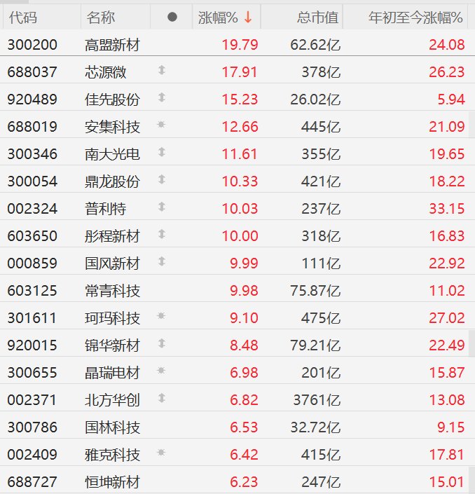 | 代码 | 名称 | | 涨幅% ↓ | 总市值 | 年初至今涨幅% | | --- | --- | --- | --- | --- | --- | | 300200 | 高盟新材 | | 19.79 | 62.62亿 | 24.08 | | 688037 | 芯源微 | 1 | 17.91 | 378亿 | 26.23 | | 920489 | 佳先股份 | 1 | 15.23 | 26.02亿 | 5.94 | | 688019 | 安集科技 | 兼 | 12.66 | 445 Z | 21.09 | | 300346 | 南大光电 | 1 | 11.61 | 355亿 | 19.65 | | 300054 | 鼎龙股份 | 1 | 10.33 | 421亿 | 18.22 | | 002324 | 普利特 | 1 | 10.03 | 237亿 | 33.15 | | 603650 | 彤程新材 | 1 | 10.00 | 318亿 | 16.83 | | 000859 | 国风新材 | 1 | 9.99 | 111亿 | 22.92 | | 603125 | 常青科技 | | 9.98 | 75.87 ...