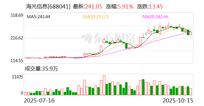 前三季度,海光信息经营活动产生的现金流量净额达到22.55亿元,较2024年同期的3.99亿元大幅增长 465.64%。公司称,这主要系公司业务增长较快,收入增长,销售回款以及预收款项增加所致。 研发方面,海光信息第三季度投入12.24亿元,同比大幅增长53.83%;前三季度的研发投入同比增长 35.38%至29.35亿元。公司称,这是因为其持续加大研发投入力度,产品竞争力不断增强,围绕新一代 海光通用处理器芯片设计、海光处理器关键技术研发等项目的研发进度加快。 10月15日晚间,算力"牛股"海光信息(688041.SH,股价241.05元,市值5603亿元)披露2025年第三季 度报告。 报告显示,公司第三季度营收为40.26亿元,同比增长69.60%;归母净利润为7.6亿元,同比增长 13.04%;扣非净利润7.27亿元,同比增长10.56%。另外,公司前三季度营收为94.9亿元,同比增长 54.65%;归母净利润为19.61亿元,同比增长28.56%;扣非净利润18.17亿元,同比增长23.18%。 可以看出,无论是第三季度还是前三季度,海光信息净利润的增速均远低于营收增速。此外,《每日经 济新闻》记者 ...
